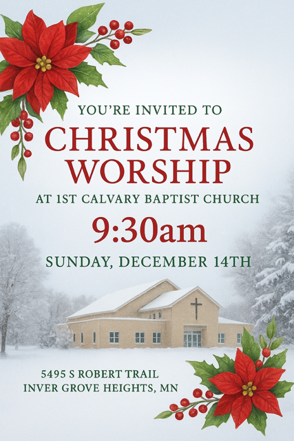 Our mission at First Calvary is simple: we exist to glorify God by striving to produce loving, serving disciples of Jesus Christ. To join with you in your pursuit of God, we’d love to meet you, hear your story, and share the hope we have from the life-changing message of Jesus Christ. Join us on a Sunday in Inver Grove Heights to study God’s Word, connect with one another, and proclaim the gospel to the ends of the earth.